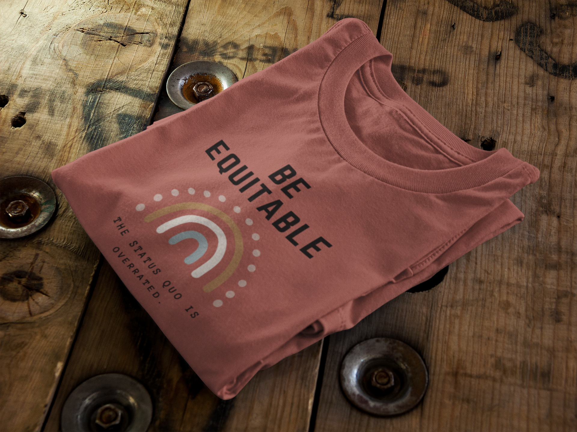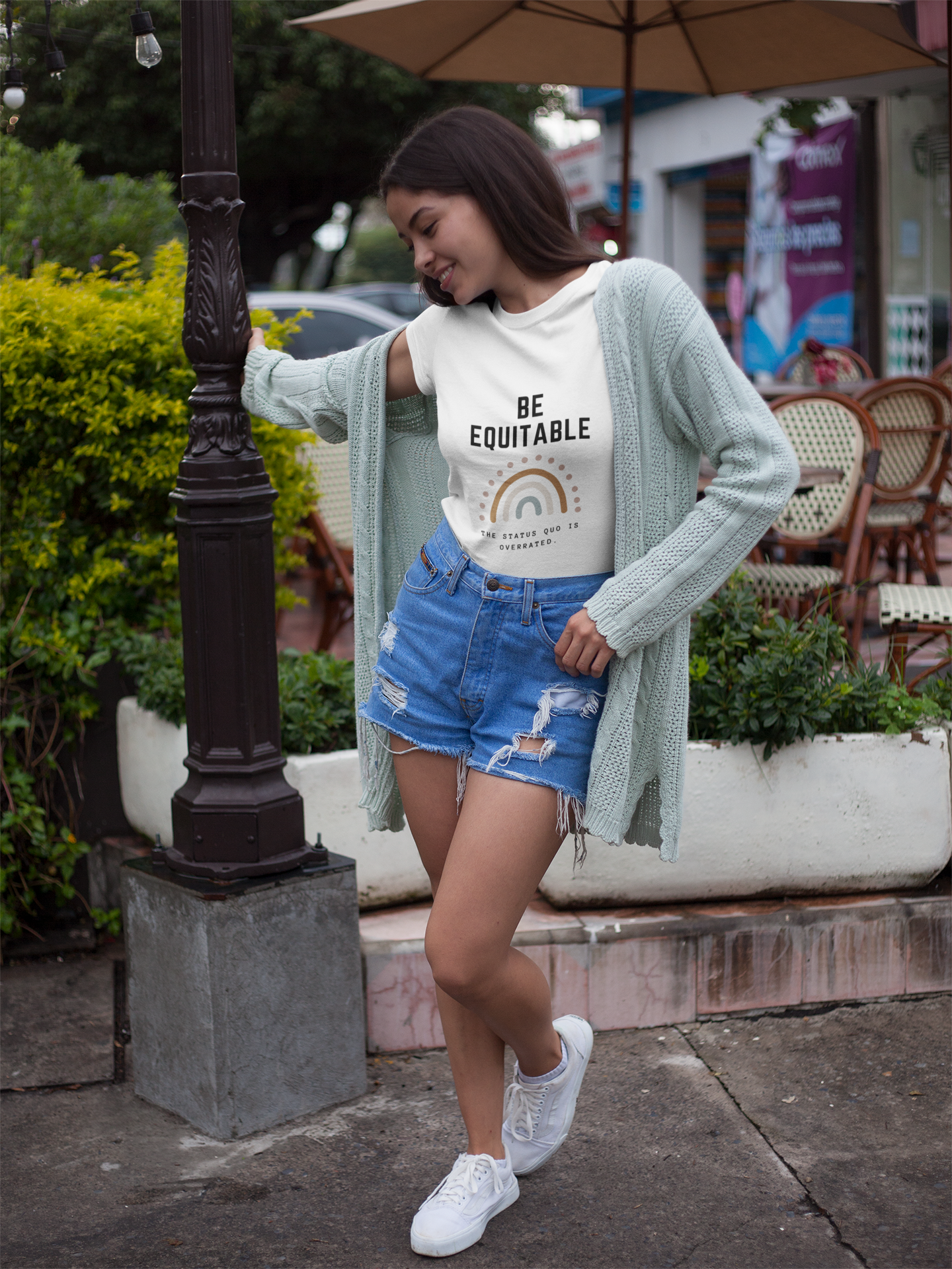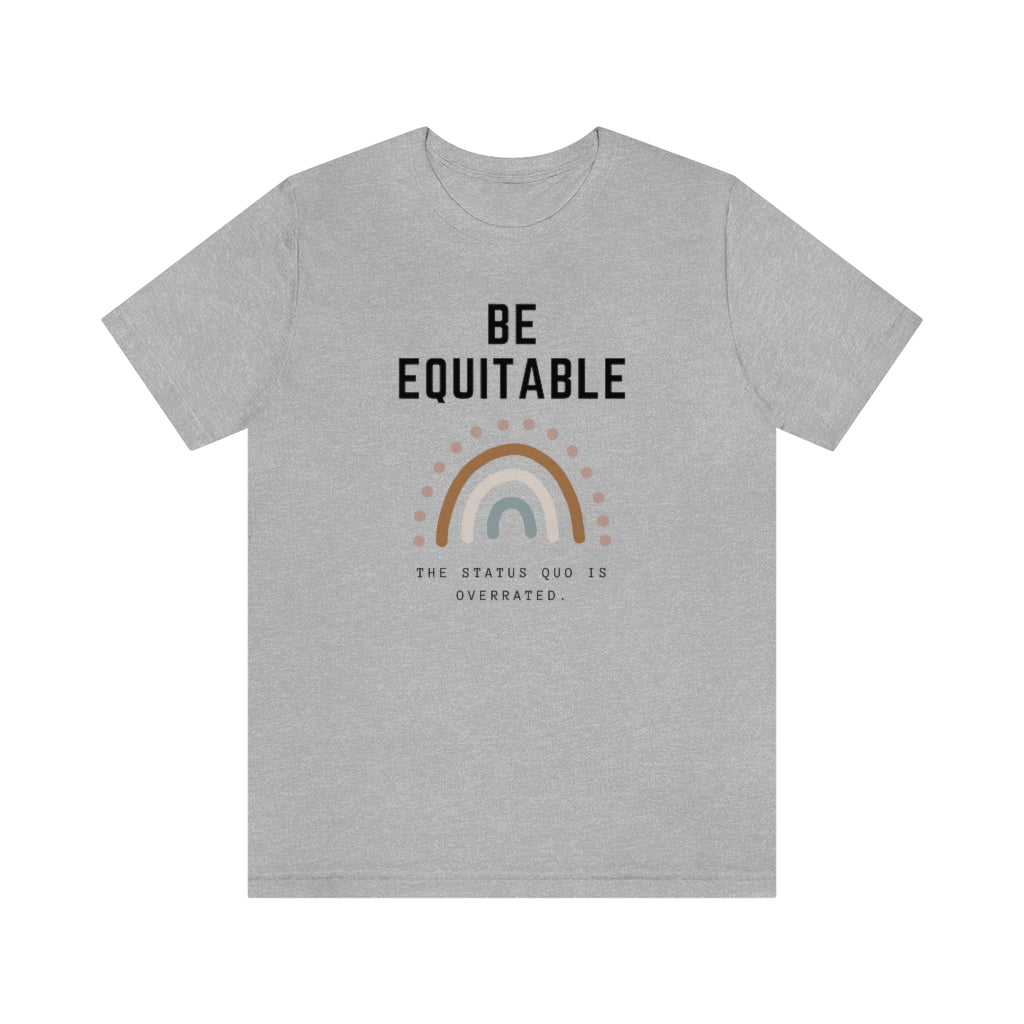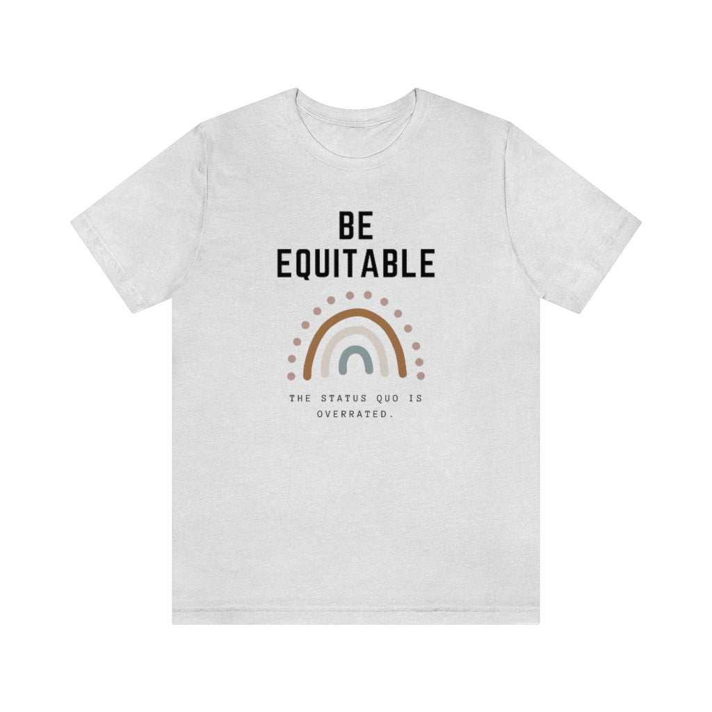 Elevate your wardrobe with this inspiring 'Be Equitable' T-Shirt featuring a minimalist rainbow design and the thought-provoking message "The Status Quo is Overrated." Perfect for anyone who advocates for equality and wants to make a positive statement. This comfortable unisex tee is an excellent gift for activists, teachers, or anyone who believes in inclusiveness and change. Spread positivity and spark meaningful conversations every time you wear it.