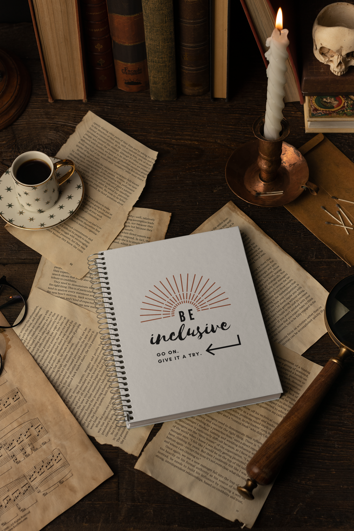 Elevate your daily journaling with this beautiful spiral notebook featuring the uplifting message "Be inclusive, give it a try". This notebook, with its clean and inspiring design, is perfect for personal growth, sketching, jotting down thoughts, or as a thoughtful gift. With its sturdy cover and plenty of lined pages, it's the ideal companion for thinkers, dreamers, and anyone looking to add a touch of positivity to their day.