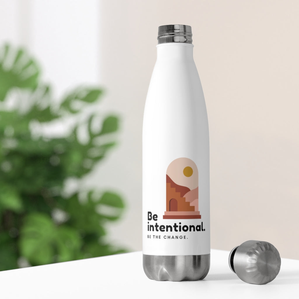 Stay inspired and hydrated with our stainless steel insulated bottle featuring the motivational saying "Be intentional. Be the change." Perfect for those who are on-the-go, this eco-friendly water bottle keeps your drinks at the right temperature for hours. Ideal for workouts, office, or travel. With a sleek white background and an eye-catching, minimalist design, this bottle is both practical and aesthetically pleasing. Make a statement about your commitment to sustainability and personal growth with every sip!