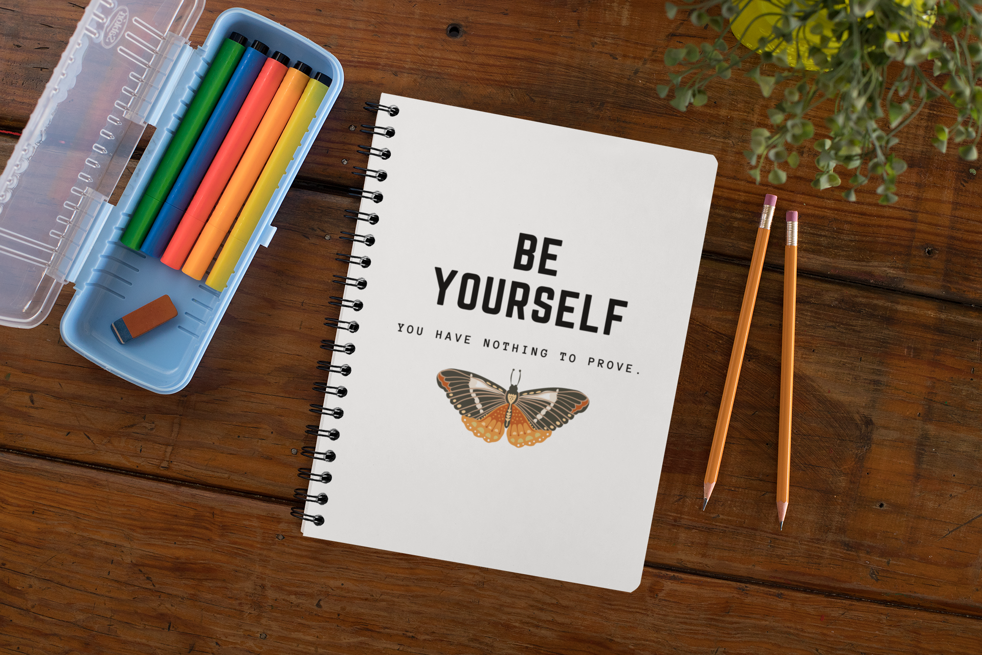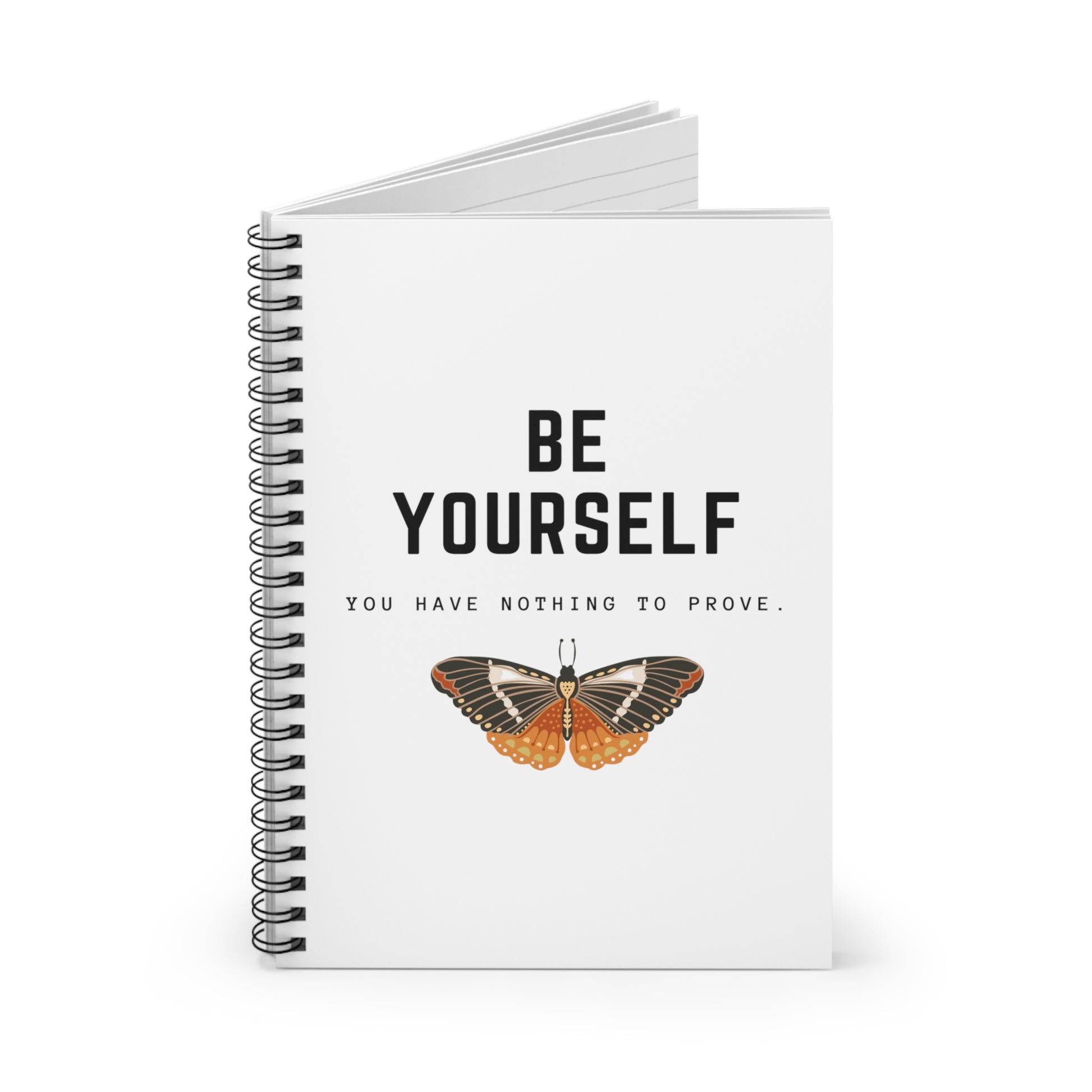 Keep your thoughts and reflections close at hand with this beautifully designed spiral notebook. It features an uplifting message "Be Yourself, You Have Nothing To Prove" coupled with a delicate butterfly motif that adds a touch of nature's grace. This notebook is perfect for daily journaling, as a personal diary, or as a thoughtful gift for a friend who appreciates motivational quotes. The durable cover and lined pages make it easy to write in, whether you’re at home, in the office, or on the move.