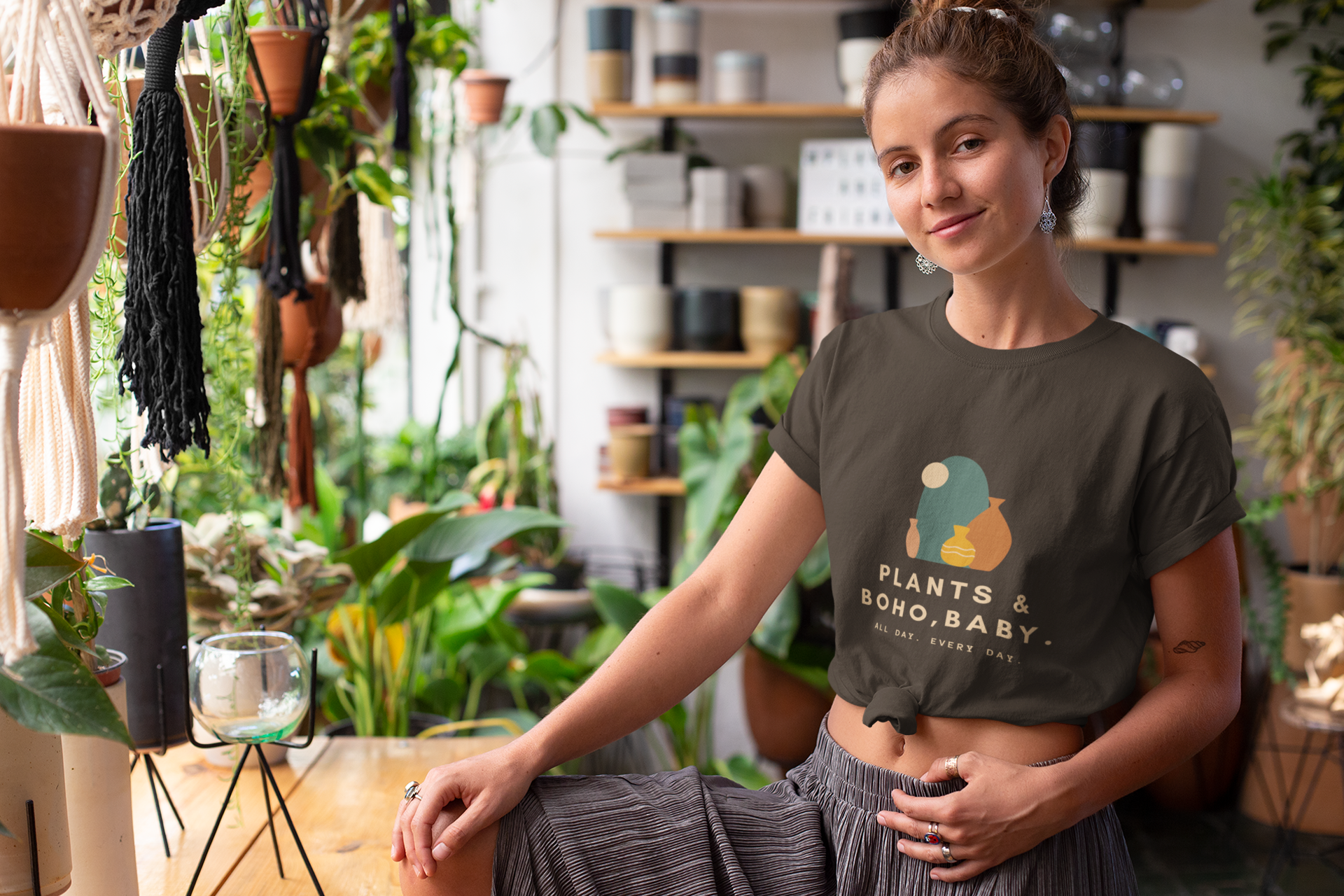 Embrace your love for plants and boho style with this chic graphic tee. A perfect blend of comfort and fashion, this modern botanical t-shirt is suitable for everyday wear or as a trendy gift for the garden enthusiast in your life. The minimalist plant and pot design set against a clean background makes it a versatile piece to pair with any outfit. Crafted from high-quality materials, it's designed to last through every season.